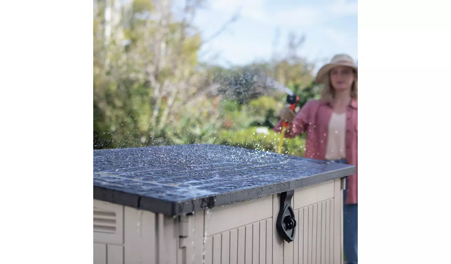 - Ideal outdoor storage solution for garden tools and equipment, BBQ and accessories and x2 120L wheelie bins
